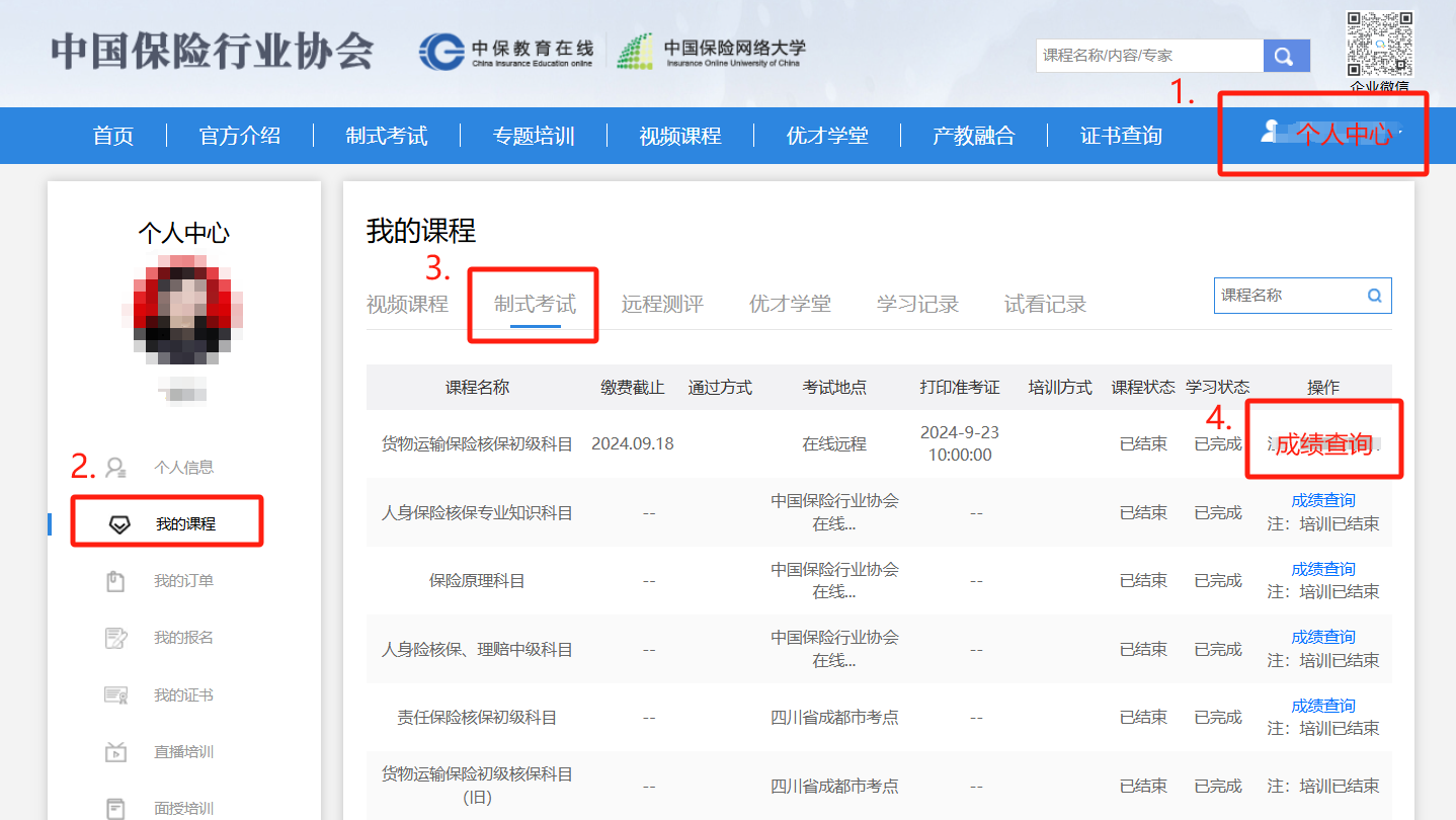 2025年保险行业制式考试(人身险两核、车险查勘定损、非车险核保)第三期考试已于10月25日举行,现将成绩发布及证书生成事宜通知如下: 一、最终成绩发布时间为2025年10月31日,查询路径为:个人中心--我的课程--制式考试--成绩查询。